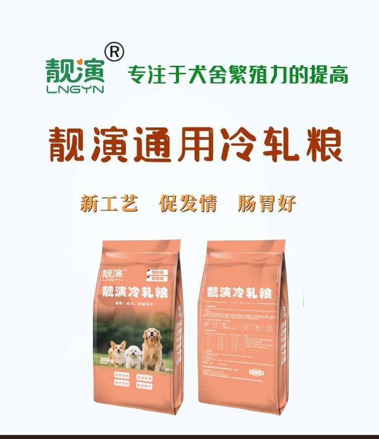 靓演通用冷轧粮,繁殖犬舍专用,采用低温冷轧犬粮,主要原料:进口鱼粉,鸡肉粉,全蛋粉、氨基酸、益生菌等,产品特点: