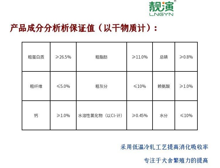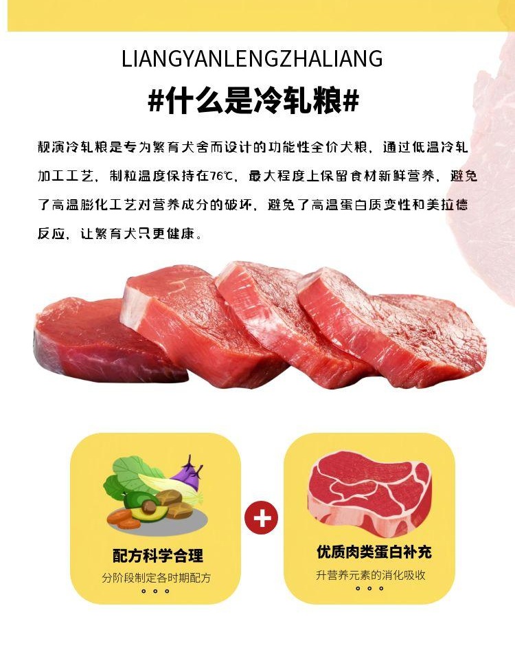 靓演繁殖哺乳冷轧粮,添加肉松适口性更好。冷轧粮是专为繁育犬舍而设计的功能性全价犬粮,通过低温冷轧加工工艺,使得犬粮内部结构疏松易溶于水,更易咀嚼和在胃内消化,减轻了爱犬消化道的负担。制粒温度保持在76℃,最大程度上保留食材新鲜营养,避免了高温膨化工艺对营养成分的破坏,让繁育犬只更健康。